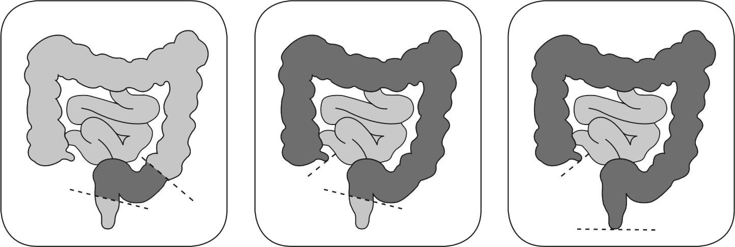 به برداشتن کولون سیگموئید (Sigmoid colectomy)، کولکتومی سیگموئید گفته میشود. به برداشتن تمام روده بزرگ به جز قسمت انتهایی آن، کولکتومی ناکامل (توتال یا ساب توتال کولکتومی (Subtotal or total colectomy) ) گفته میشود. به برداشتن تمام روده بزرگ، پروکتوکولکتومی (Proctocolectomy) گفته میشود.